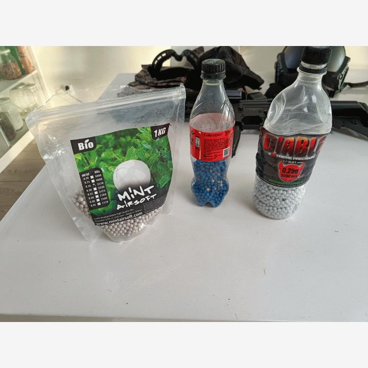 -Aseen, kaksi lipasta, akun, laturin ja kuulat. 1,2 joule