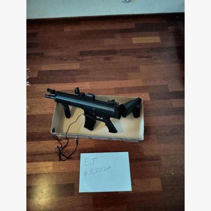 FN scar L. Muovi runkone taitettavalla ja pituutta säädettävällä perällä. Käynyt vain kerran peleissä, muuten ammuttu tölkkejä mökillä. Mukaan akku, laturi ja vertikaali grippi