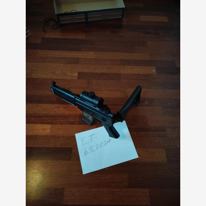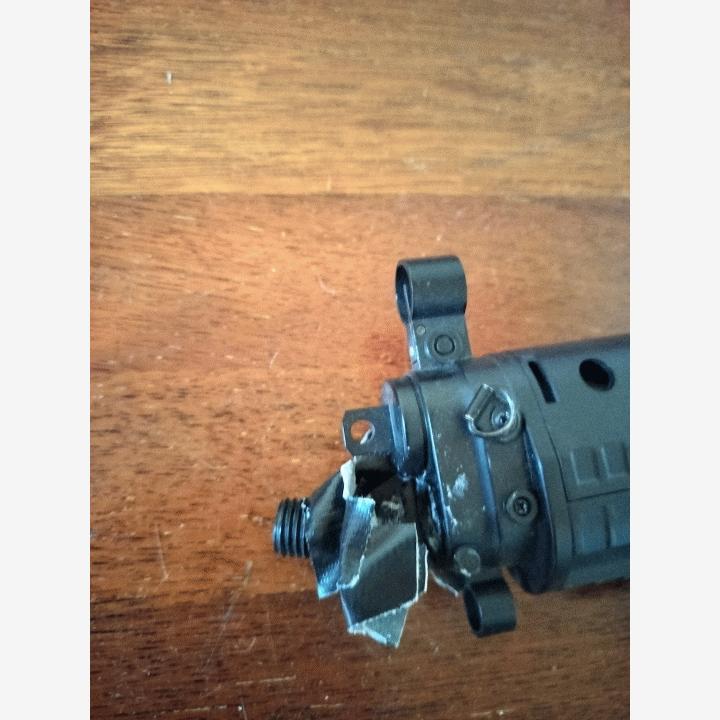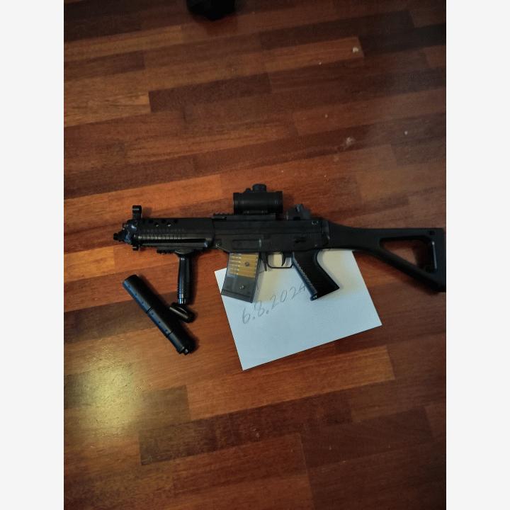 Sig seals 556. jeesuksen vanha pyssy, jonkinäköne hopinsäätö löytyy. Etupään kierteet irronnut, saa epoksilla tms. takaisin kiinni. "tähtäimestä" patterit vähissä joten uusimista suositellaan... mukaan akku, laturi ja vertikaali grippi