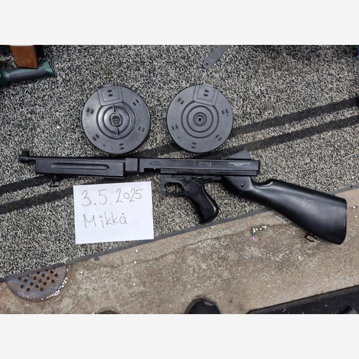 Thompsonin kuularuisku. MuovirunkoPari lipasta, joista toisesta puuttuu veivi