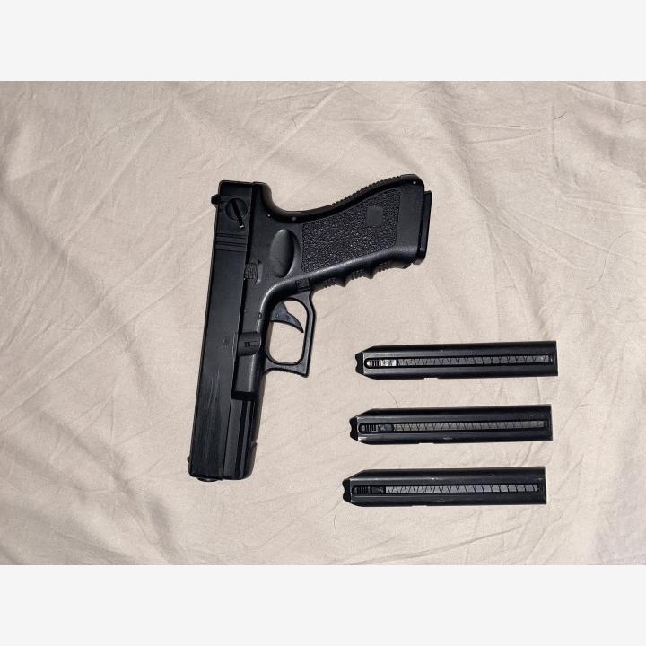 Snow Wolf M24 muutamat pelit vain pelattu ja milgearin toimesta asennettu jonkunlainen virityspaketti. Mukaan pibod, varalipas sekä 0,4g kuulia. Sähkö glock18 kolmella lippaalla ja akku tuore käynyt kans muutaman pelin. Glockin mukaan holsteri liipasinreiän pikalukolla.Nouto Oulun Pateniemestä.