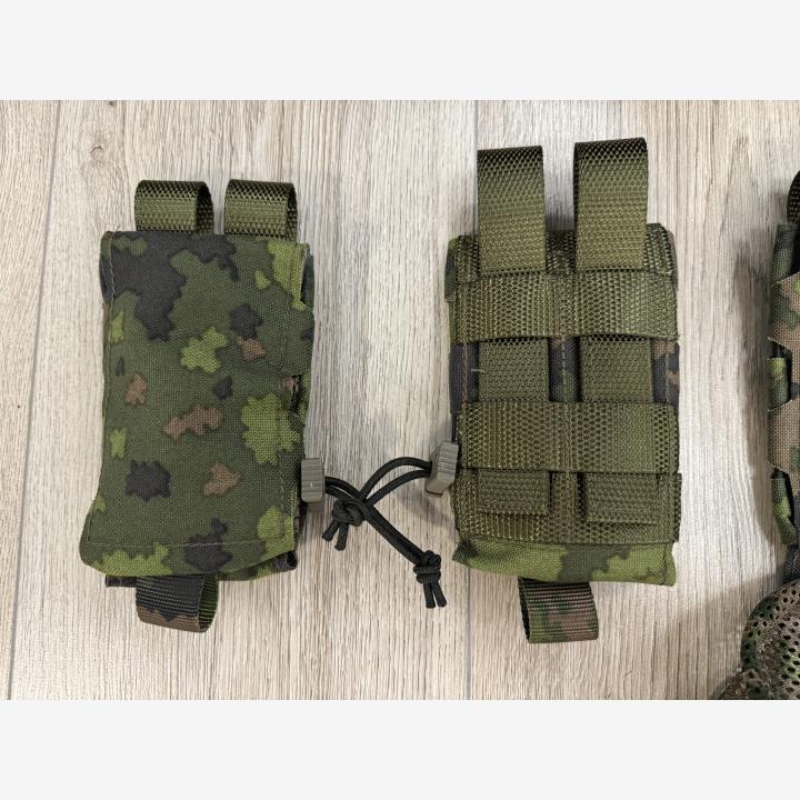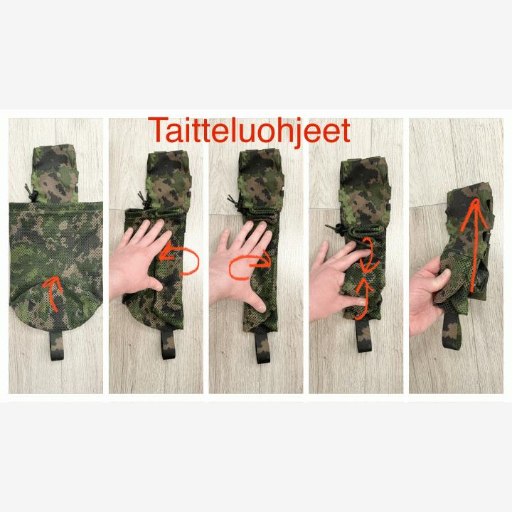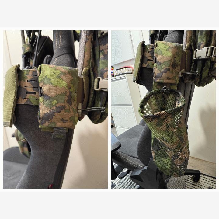 Kevyt ja piiloon taiteltava dumppitasku. Valmistettu 1000D Foxdurasta ja paksusta, vahvasta verkkoneuloksesta M05 värityksellä.Tasku on suunniteltu nimenomaan liivin cummerbundiin kiinnittyväksi, josta se tulee tarpeeksi alas käyttöä varten. Kehitteillä on mulla myös samasta pussista vyökiinnitteinen versio, jossa pussi tulee ylemmäksi.