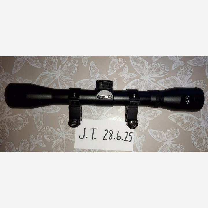 Joku toimiva 4x32 kiikari. Jos tuo Strike ei ole valmistaja niin ei ole siitä sen enempää tietoa, tähtäinkuva näkyy sisällä ja ehjä on.