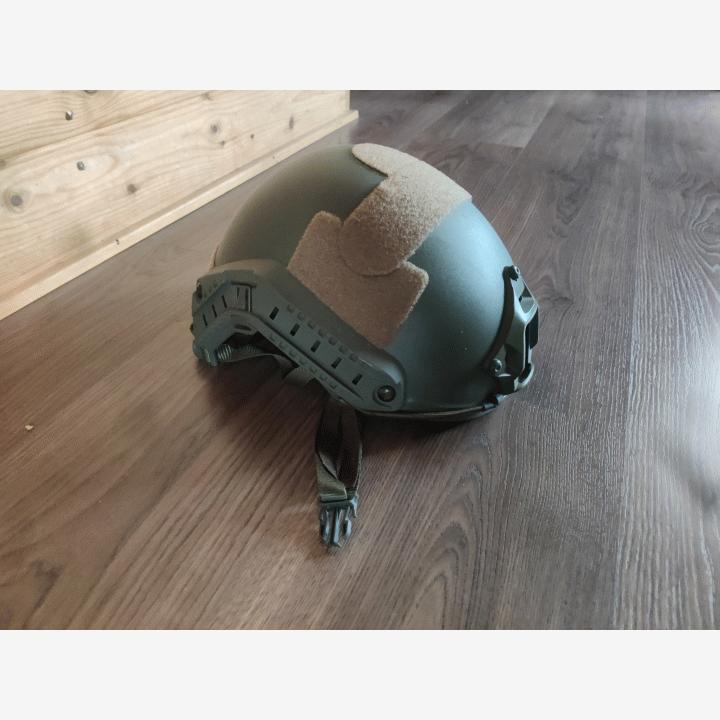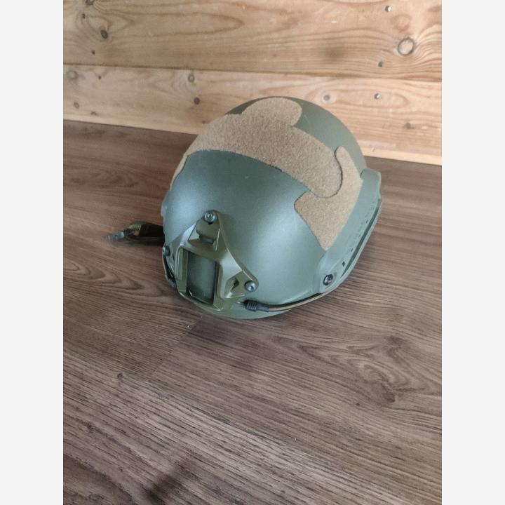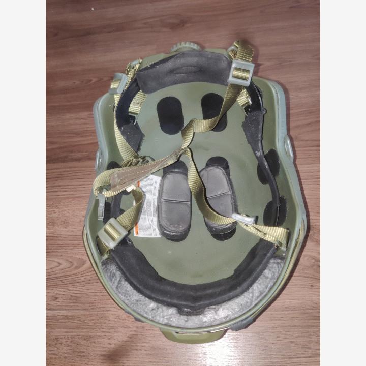 Perus fast-tyylinen metsänvihreä kova hattu. Ei suojaa oikeinta luodeilta, kuulat kyllä kimpoilee pois. Sivuissa kiskoa, taitaa jopa about toimia, joskus leukasuoja oli kiinni. Edessä kuminauhat jotka toimii, mutta nvg-liitäntää en koskaan kokeillut.Lisää kuvia ja tietoja