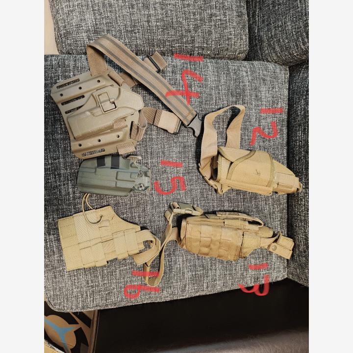 13. Merkkiä x kangasholsteri pistoolille ja yhdelle varalippaalle. Tulee reiteen ja vyöhön kiinni, hinta 10e