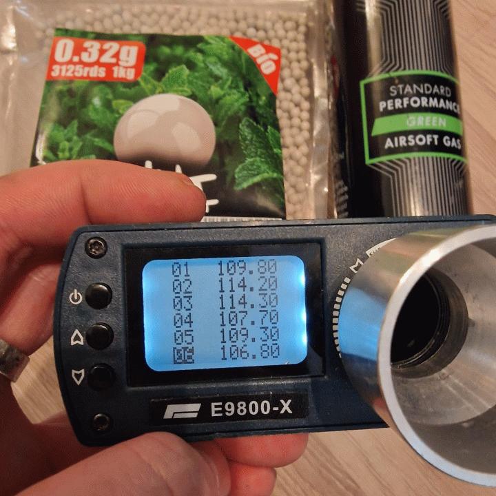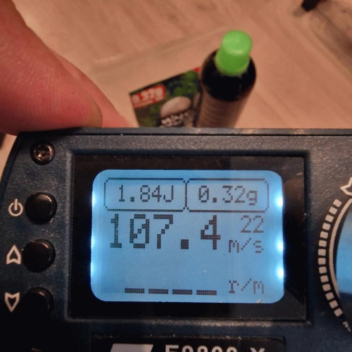 Testattu äsken vihreellä kaasulla ja 0,32g kuulalla ~1,85J tai 110m/s, tätä voi säätää NPASsilla