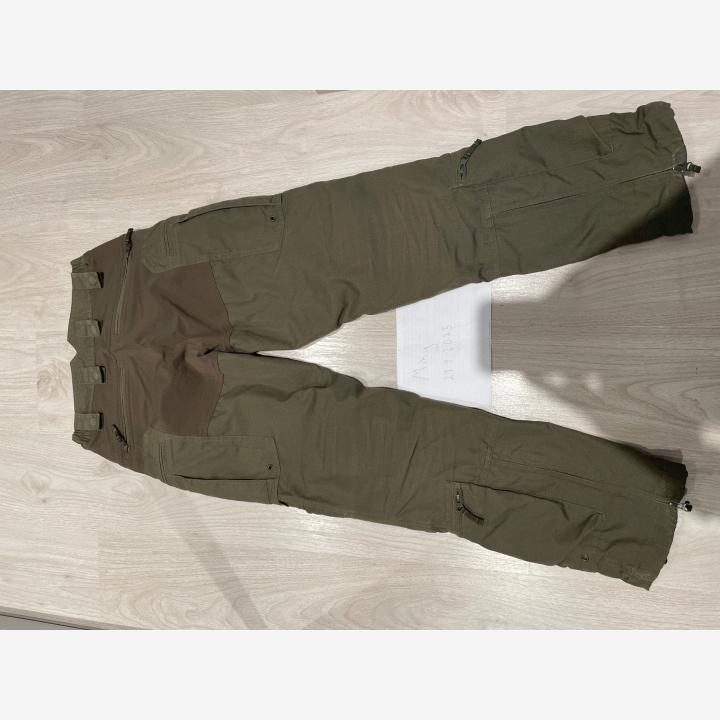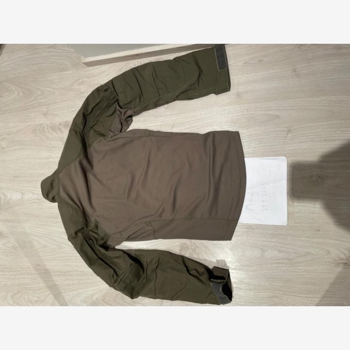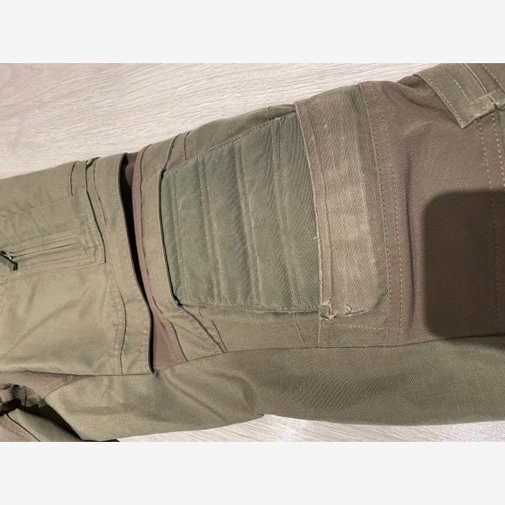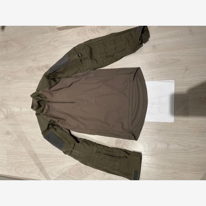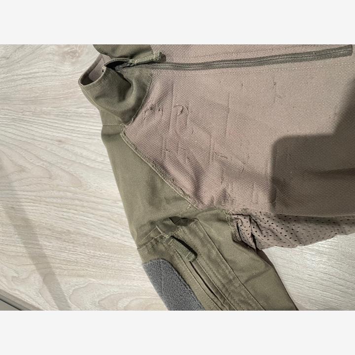 -Housujen oikeassa polvessa pientä kulumaa.-Taistelupaidassa oikeassa olkapäässä aseen perän aiheuttamaa kulumaa.