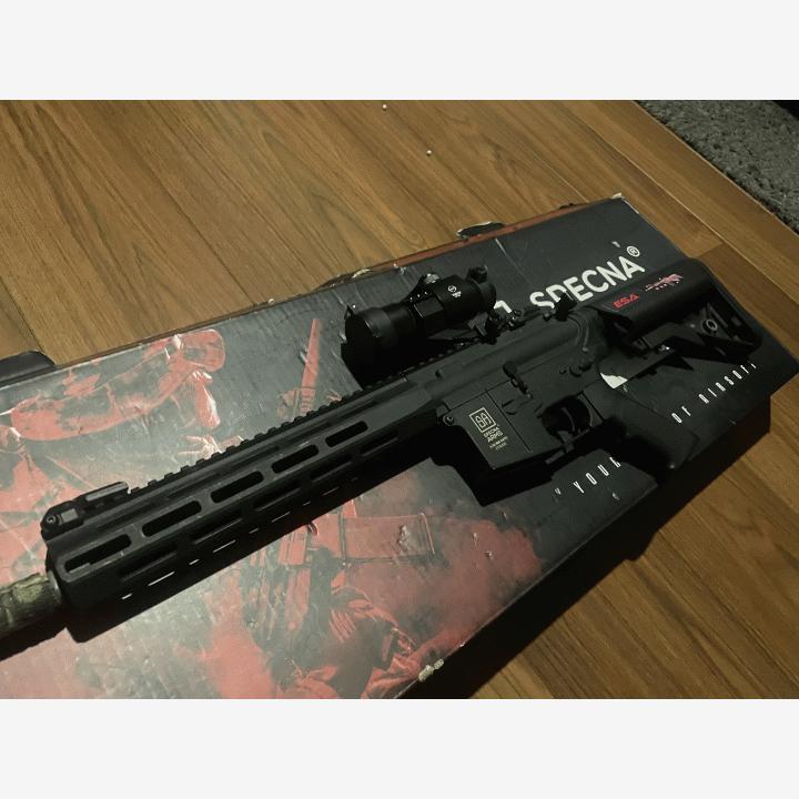 Specna Arms SA-F03 ase varustettuna Theta Optics punapiste tähtäimellä aseella pelattu vain parit pelikerrat ja toimii täydellisesti. Aseessa on kiinni tällä hetkellä M90 jousi mutta mukaan tulee M120. Mukaan myös 3000mah akku jossa on riittänyt virta jokaisen pelin ajan.TÄYTYY OSTAA UUSILIPAS (15e) Specna arms s-mag