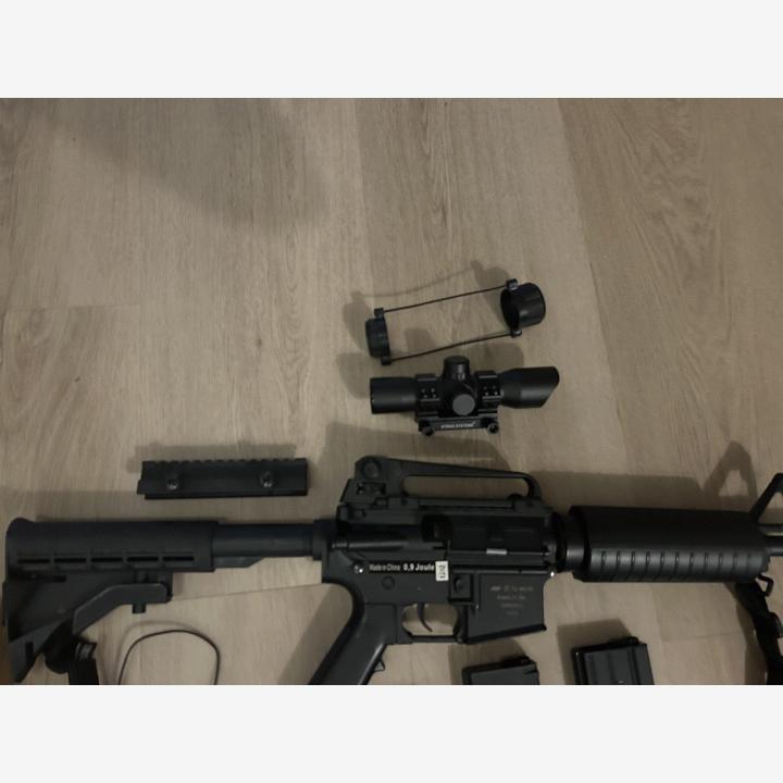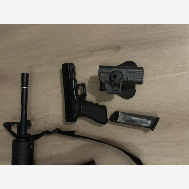 Asg M-16 sähkökivääri 100€ + 15€ kantonauha eli yht 115€Tokyo marui glock 17 (jotain häikkää, ei taida mennä kaasua sisälle kunnolla, kun ampuu vaan pari kutia) 50€ plus holdsteri sille 10€