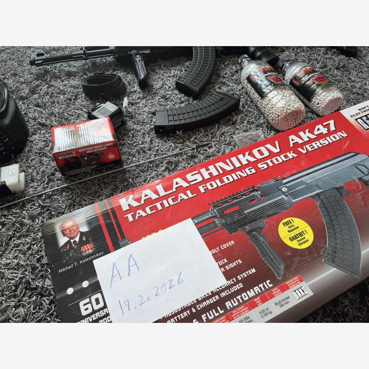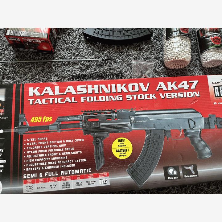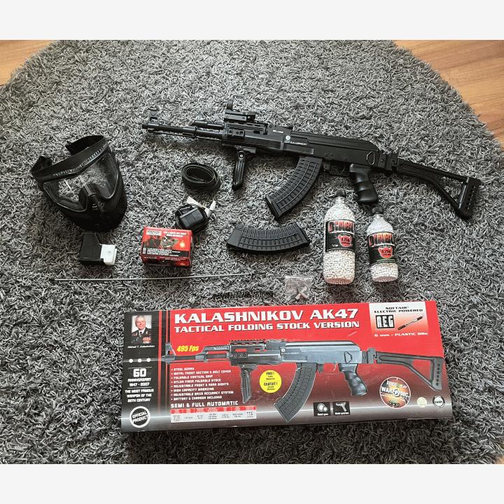 Tässä hyvä airsoft setti ja ampuu ainakin omasta mielestä lujaa ja on laadukas kampeAseena on ak47 kalashnikov tactical folding stock version joka on tehokas mukava airsoft ase