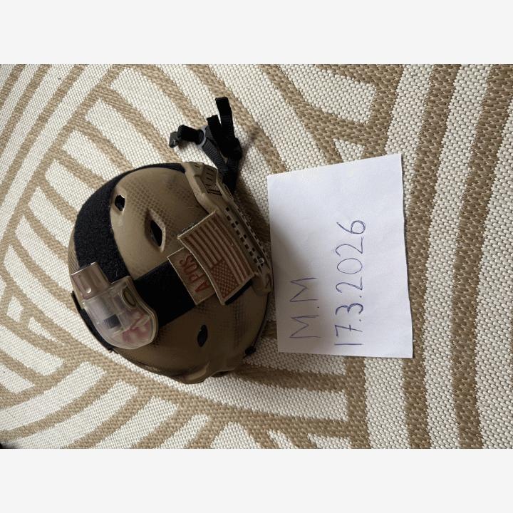 Tästä jollekulle edullinen natosotakuperkeikka-potta. Ostin käytettynä joten tarkkaa merkkiä ja mallia en tiedä. Maalattu, reilusti velcroa ja löytyy kiskonpätkät kyljestä.Päällä kiinakopio Manta-valosta, mulla ei sopivaa paristoa että voisin testata toimiiko eli myydään rekvisiittana.