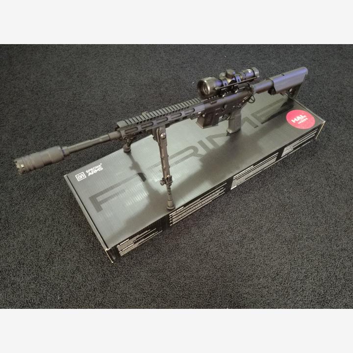 Specna Arms SA-P20 HAL ETU Prime kivääri muutettuna DMR luokan kivääriksi. SA-P20 replika ja kaikki osat ovat uusi käyttämättömiä. Kuitit löytyy.Halusin luotettavan 2,25J DMR kiväärin järkevään hintaan, joten valinta oli helppo. Pienillä muutoksilla Specnan PRIME sarjalaiseen (mm. piipun pituuden/sylinterimitan optimoinnilla ja tiiveyden parannuksilla) sekä lisäämällä tarvittavat ulkoiset hilppeet (bipod, 3-9x suurentava kiikaritähtäin, pidempi ulko- ja sisäpiippu sekä vaimennin/suuliekkiyksikkö) saatiin täydellinen DMR luokan peli.