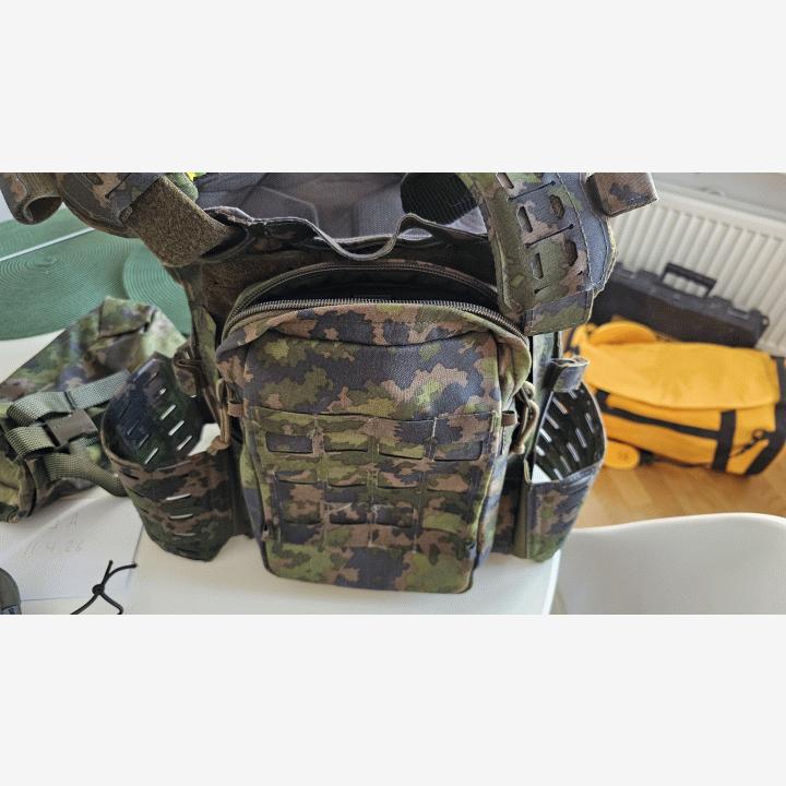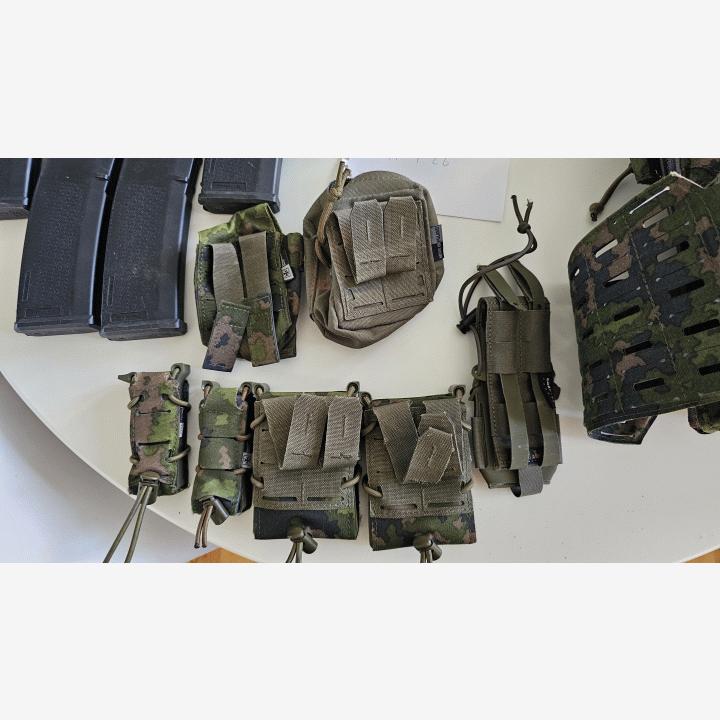 Siitä laatu varustetta seuraavalle. Kaikki on erittäin hyvässä kunnossa, yhtä pistoolitaskua lukuunottamatta (6). HUOM liivit 250€, muut erikseen.1. Templars Gear CPC suojaliivi ROC kiinnityksellä koko M, M05 kuosi + 3 lipastaskun etulevyllä + M koko juomareppu 250€