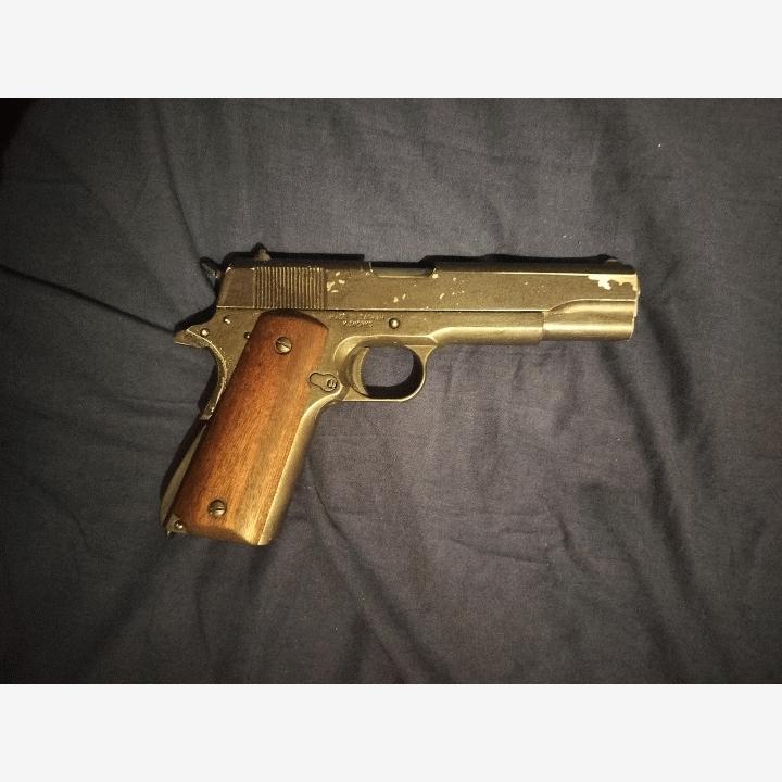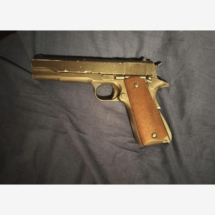 Vanha KJW CO2 1911, maalattu jollain automaalilla harmaaksi, maalipinta ottanut sitten osumaa, mutta mun mielestä näyttää jopa kivemmalle näin.Vaihdettu pähkinäpuiset kahvat.