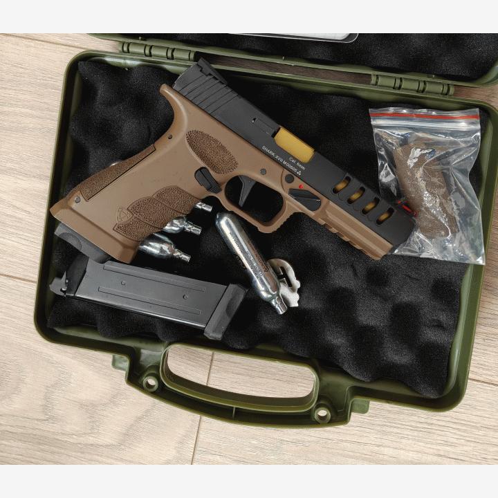 C02 toiminen sarjaa ampuva pistooli. Nuprollin kovamuovinen kotelo mukaan, 3 lipasta.